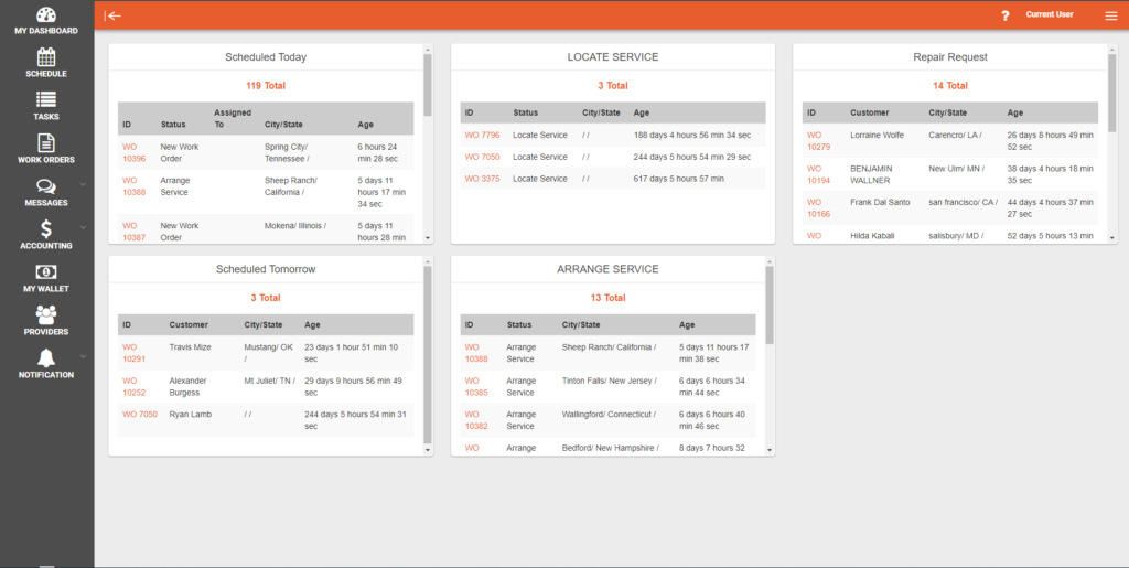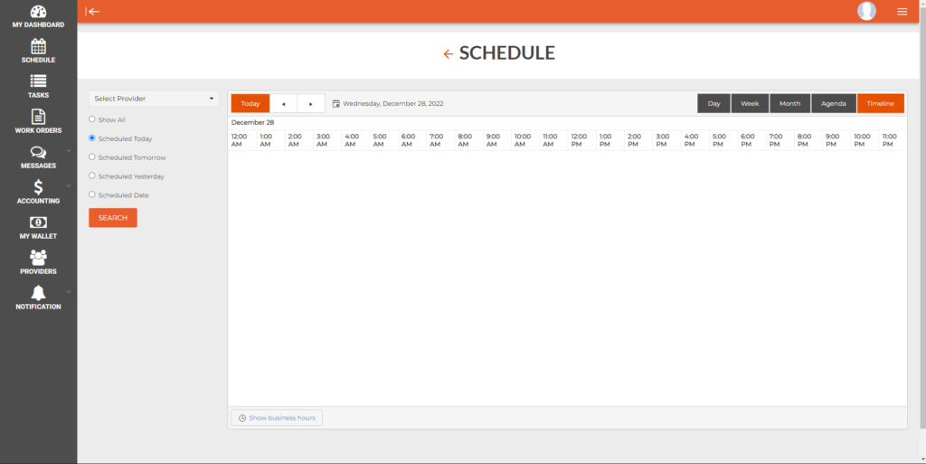 See all scheduled work orders on a timeline by day, week, or month. Access work order information directly from the schedule and view real time arrivals and status updates.